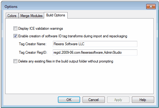 On the Build Options tab, you can specify whether or not you want to list ICE validation warnings in the Repackager output window during the Build process and you can set software ID tag file generation options.