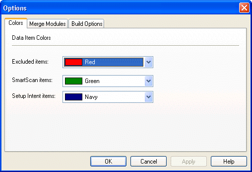 The Options dialog box, available from the Tools menu, presents options on three tabs: Colors , Merge Modules , and Build Options .