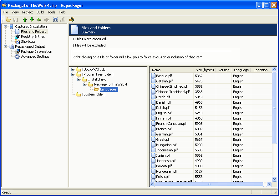 The upper pane displays the number of files captured and how many of these files will be excluded from the Windows Installer package when built. The lower-left pane provides a tree from which you can see where files will be installed and the names of the files.