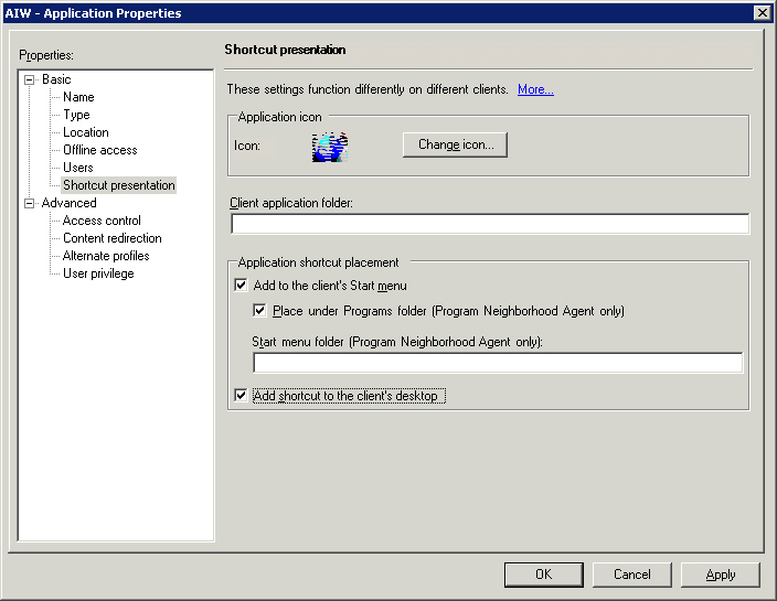 | Place under Programs folder (Program Neighborhood Agent Only) Start menu folder (Program Neighborhood Agent Only) | Select the Place under Programs folder option to create a shortcut to this application under the Programs folder of the user’s local Start menu. If you leave the Start menu folder field blank, the shortcut is created in root folder of the Programs menu. Start Programs MyApplicationFolder ApplicationName If you specify a folder structure in the Start menu folder field, the shortcut is created in that folder structure within the local Programs folder, with each folder name separated with a backslash. For example, if you entered the following in the Start menu folder field: MyApplicationFolder/ApplicationTools Then, the shortcut would be created in the following folder structure: Start Programs MyApplicationFolder ApplicationTools ApplicationName |