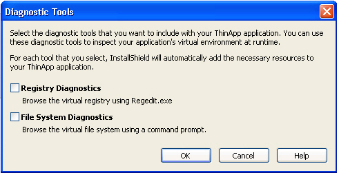 - If you want to include the Registry Editor (regedit.exe) with your ThinApp application so that you can browse the registry at runtime from within the virtual environment, select the Registry Diagnostics option.