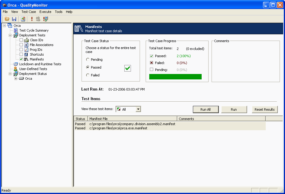 When testing is finished, results are recorded in the Test Case Progress area. Also, the Status of each test item ( Passed , Failed , or Pending ) is listed next to the Manifest File name.