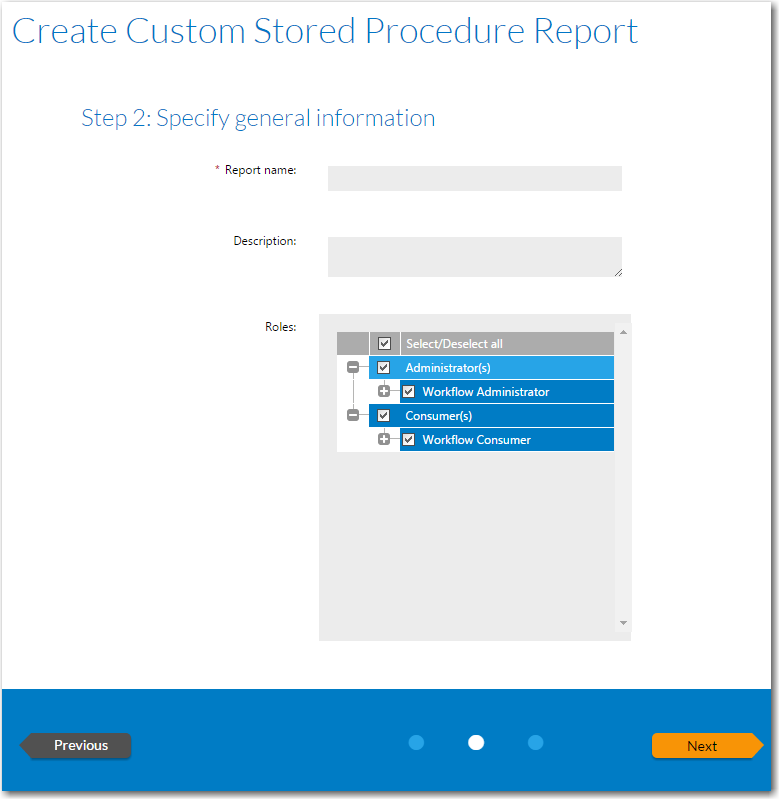 - In the navigation bar, click Create Custom Stored Procedure Report on the Reports menu. The Step 1: Select Stored procedure of the Create Custom Stored Procedure Report page opens.