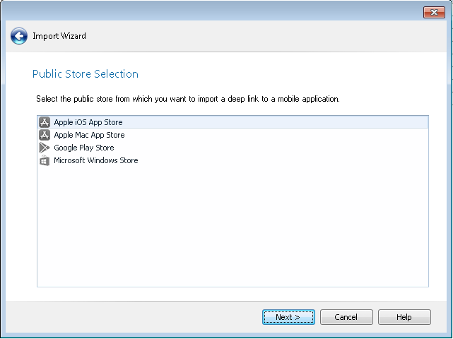- Select Link to a public store app and click Next . The Public Store Selection panel opens.