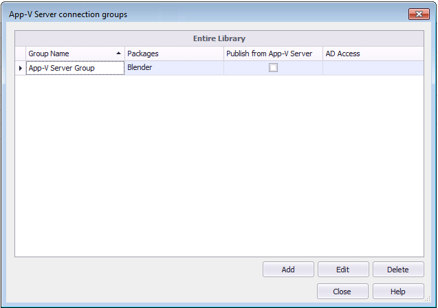 - Click App-V Virtual Environments > App-V Server Environment in the ribbon. The App-V Server Connection Groups dialog box opens, listing any defined App-V Server connection groups.