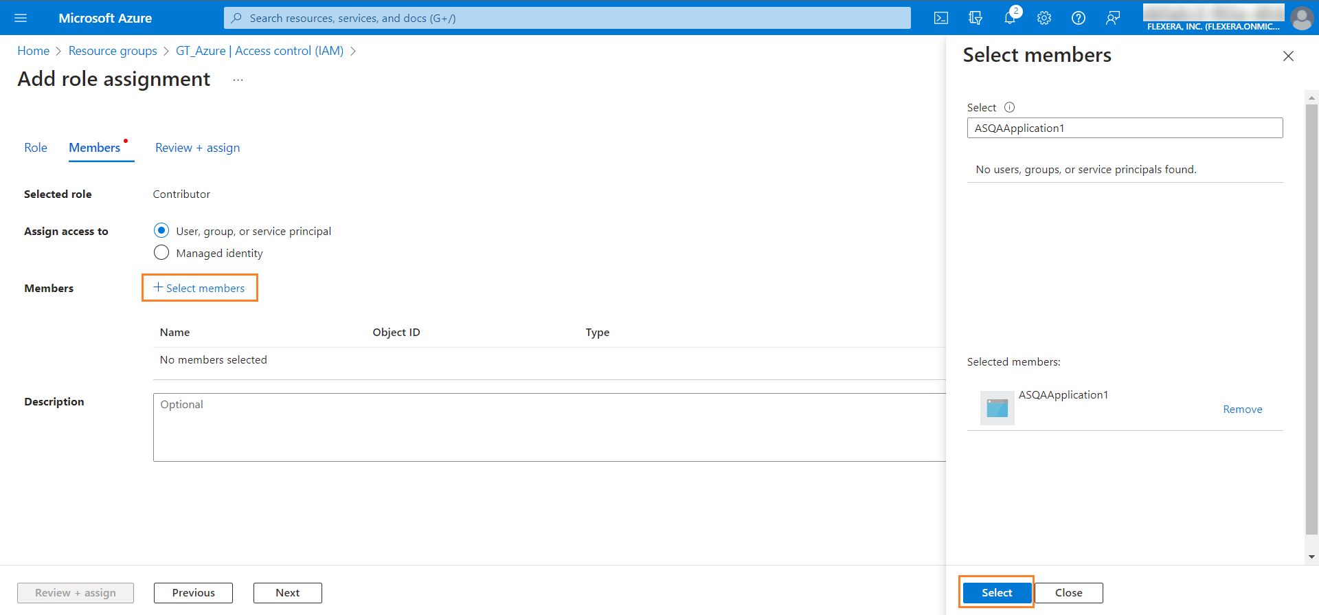- In the Members tab, click on + Select members link. A small dialog box appears on the right side.