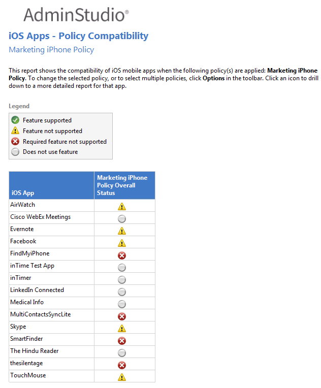 - This report displays an icon to indicate the compatibility of each iOS mobile app with the selected policy.