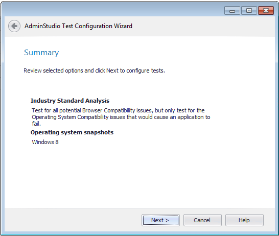 | Application Conflicts Application Virtualization Compatibility Best Practices Risk Assessment Remote Application Publishing Compatibility | Test selection in these test categories are not affected by any selections made in the AdminStudio Test Configuration Wizard . |