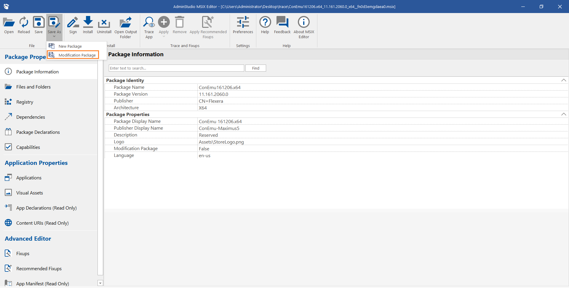 - After saving, you can see the modification package loaded in the MSIX Editor.
