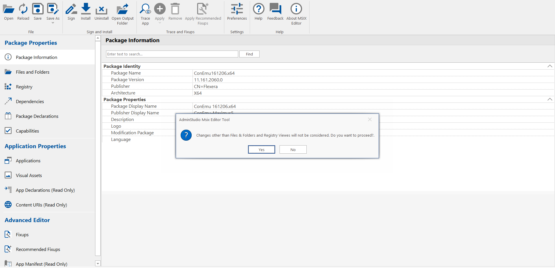 - Modify the desired package properties for the selected MSIX Package. For more details, see Editing MSIX Packages.